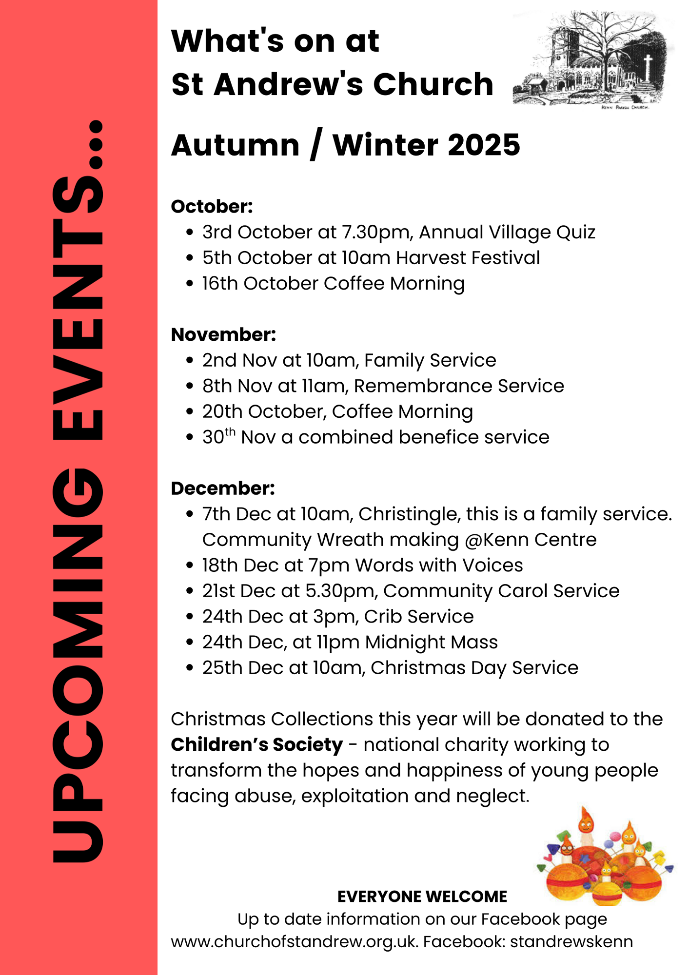 As the summer sunshine fades and we head into the autumn months, we have some exciting dates for your calendar. Make sure you make note of the upcoming social events happening from October through to Christmas. From our Harvest Festival, monthly coffee mornings, music events and Midnight Mass, there's something for everyone.